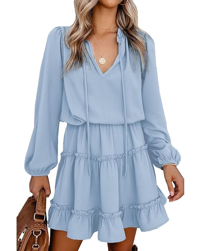 - FEATURES: S=US 4-6, M=US 8-10, L=US 12-14, XL=US 16-18, XXL=US 20 / Womens Casual Dresses / Tie V Neck / Long Sleeves With Elastic Cuff / Ruffle Collar / Elastic High Waist / Swing A-Line / Ruffle Tiered / Print, Leopard And Solid Color / Mini Short Dresses / For Spring, Summer, Fall